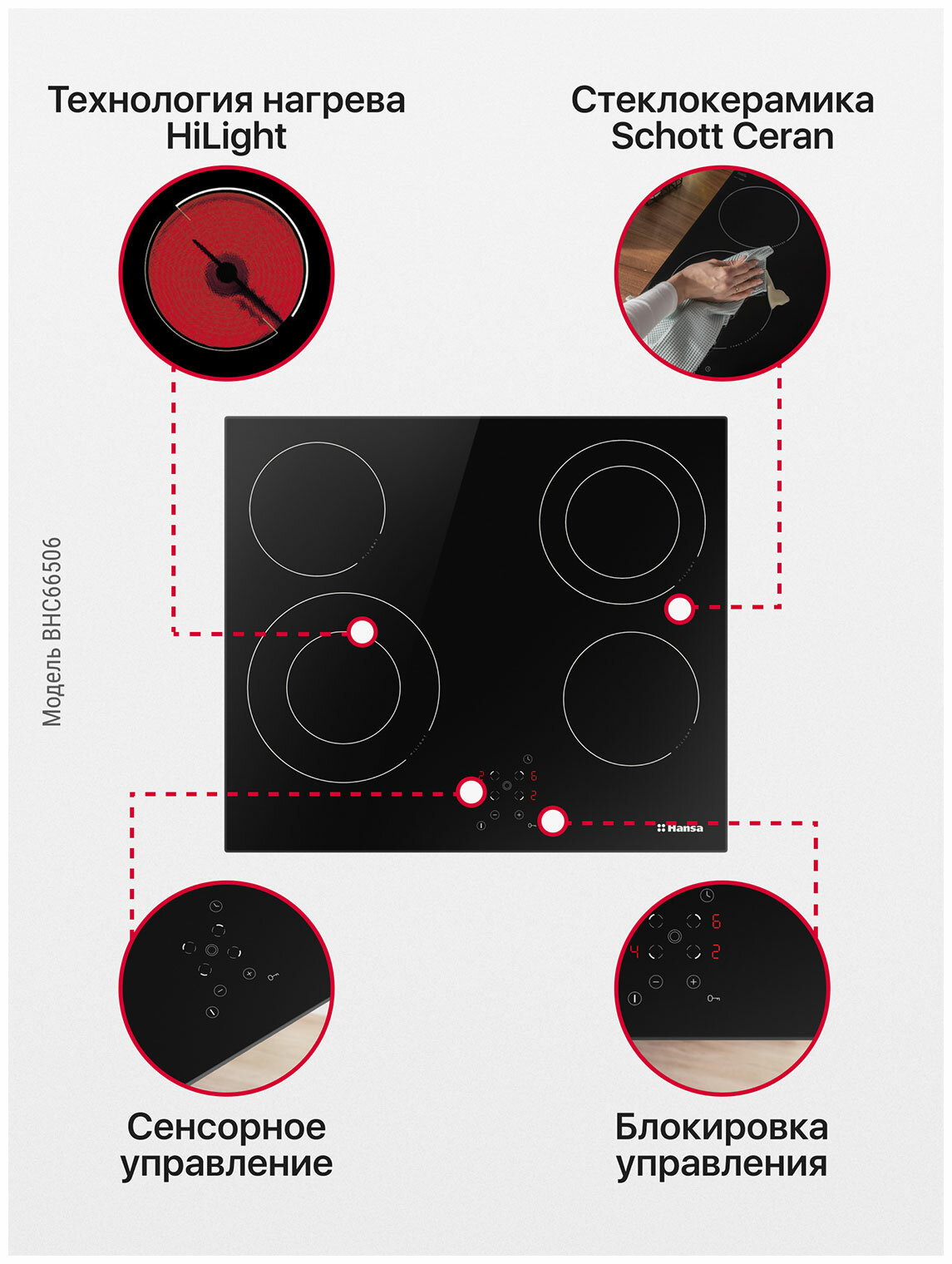 Электрическая варочная панель Hansa BHC66506, встраиваемая, 60 см, автоматика закипания, таймер автоматического отключения, стеклокерамика с сенсорным управлением