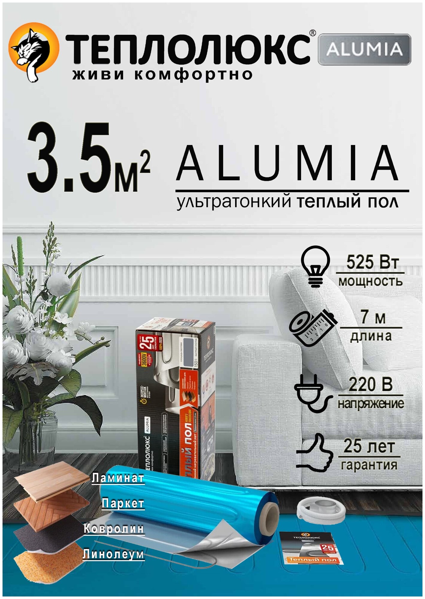 Готовим пространство для котиков и цветов! Этот вариант нам порекомендовал консультант в Максидоме (спасибо ему)! Терморегулятор рекомендовал цифровой. Подходит под ламинат, паркет, линолеум и ковролин. Толщина всего 1,5 мм, в фольге, очень легко укладывается. Заявленное потребление → 150Вт на квадратный метр. По терморегуляторам позвонил в Теплолюкс → сказали, что подходят любые цифровые, теперь ходим выбираем. И гарантия в 25 лет тоже греет;) |
