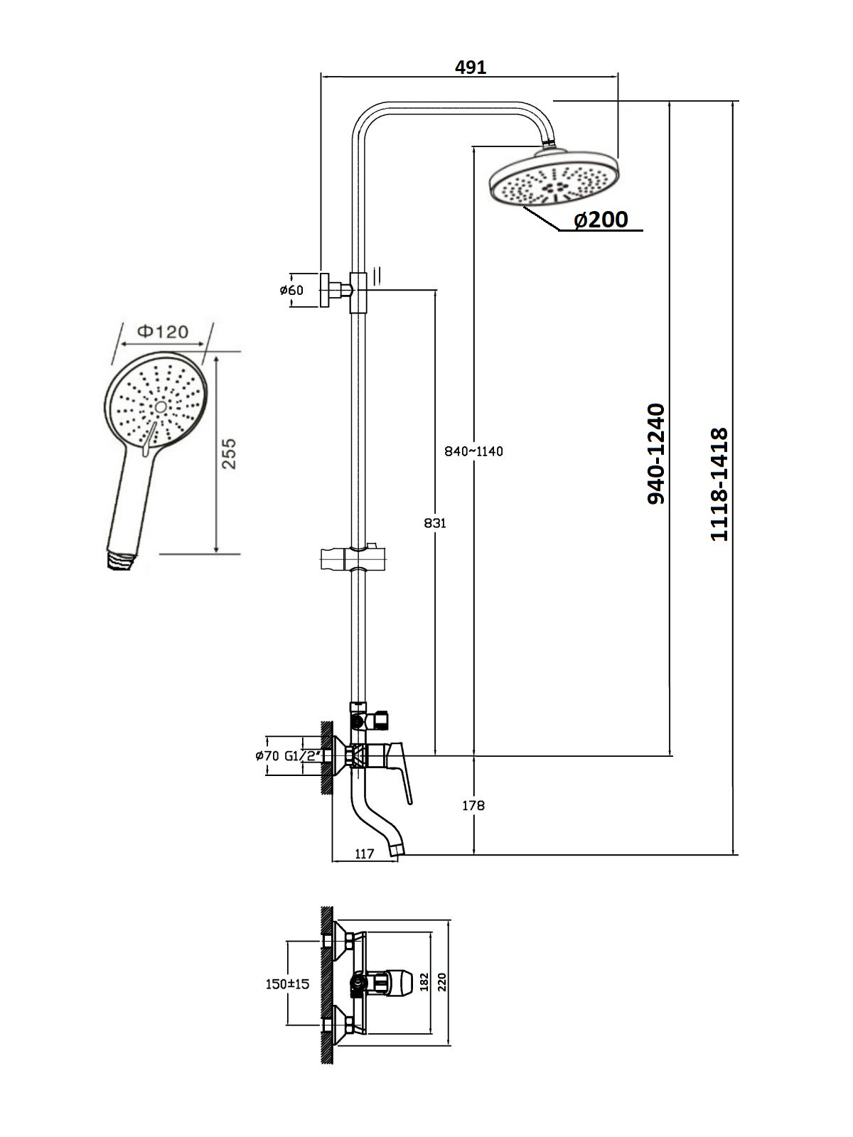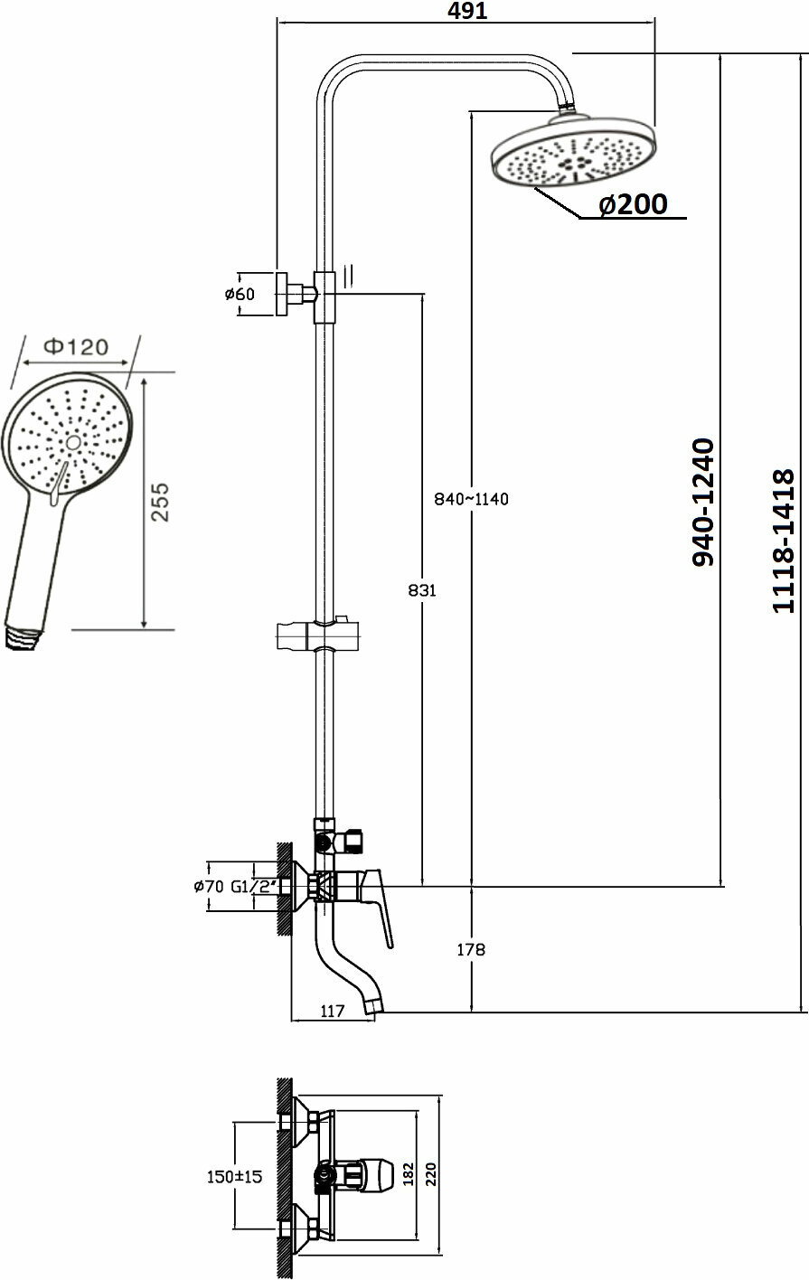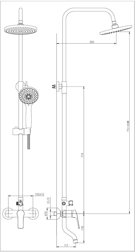 | Комплектация | Смеситель / душевая стойка / верхний душ / ручной душ / набор для подключения |