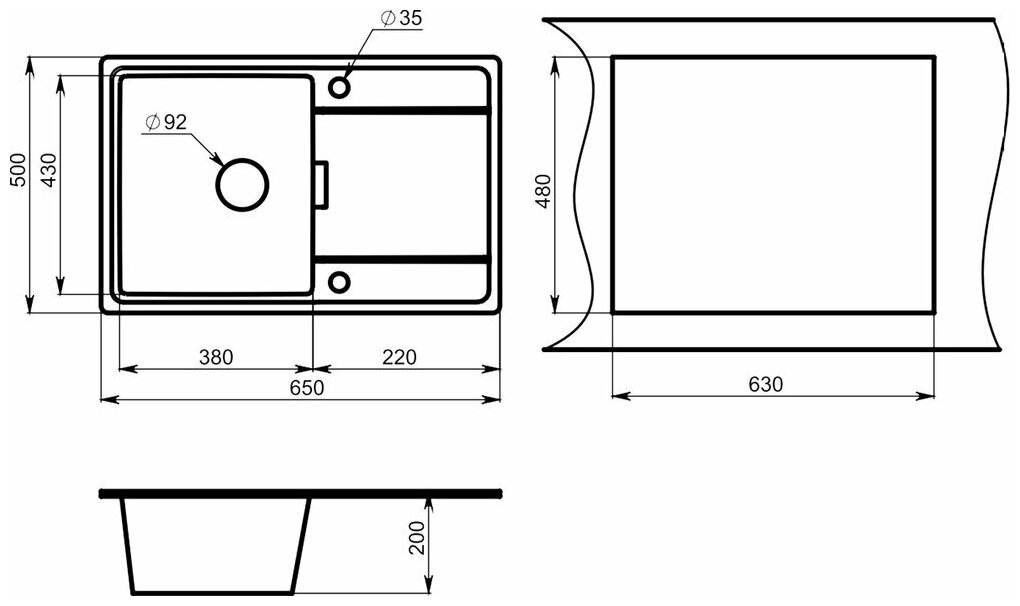 Кухонная мойка кварцевая Granula GR-6503 прямоугольная с крылом, врезная, чаша 380х430, цвет шварц (6503sv)
