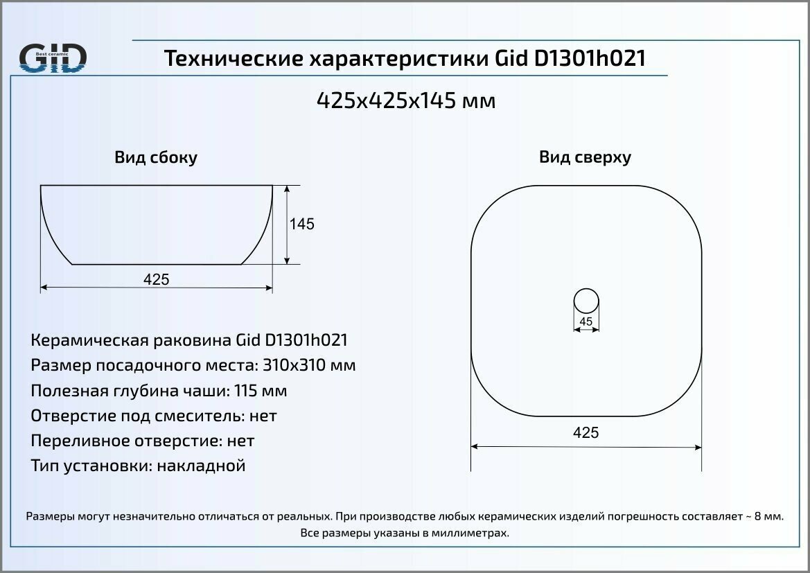 Раковина накладная Gid D1301h021 53302 42,5х42,5 см, белый/серебро