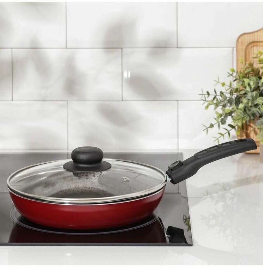 Сковорода «Альфа» d=28 см съёмная ручка стеклянная крышка антипригарное покрытие цвет бордовый