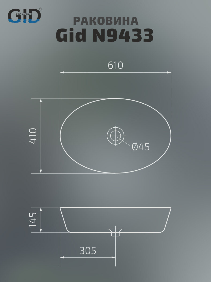 Накладная раковина 61x41х14.5 см, Gid, N9433