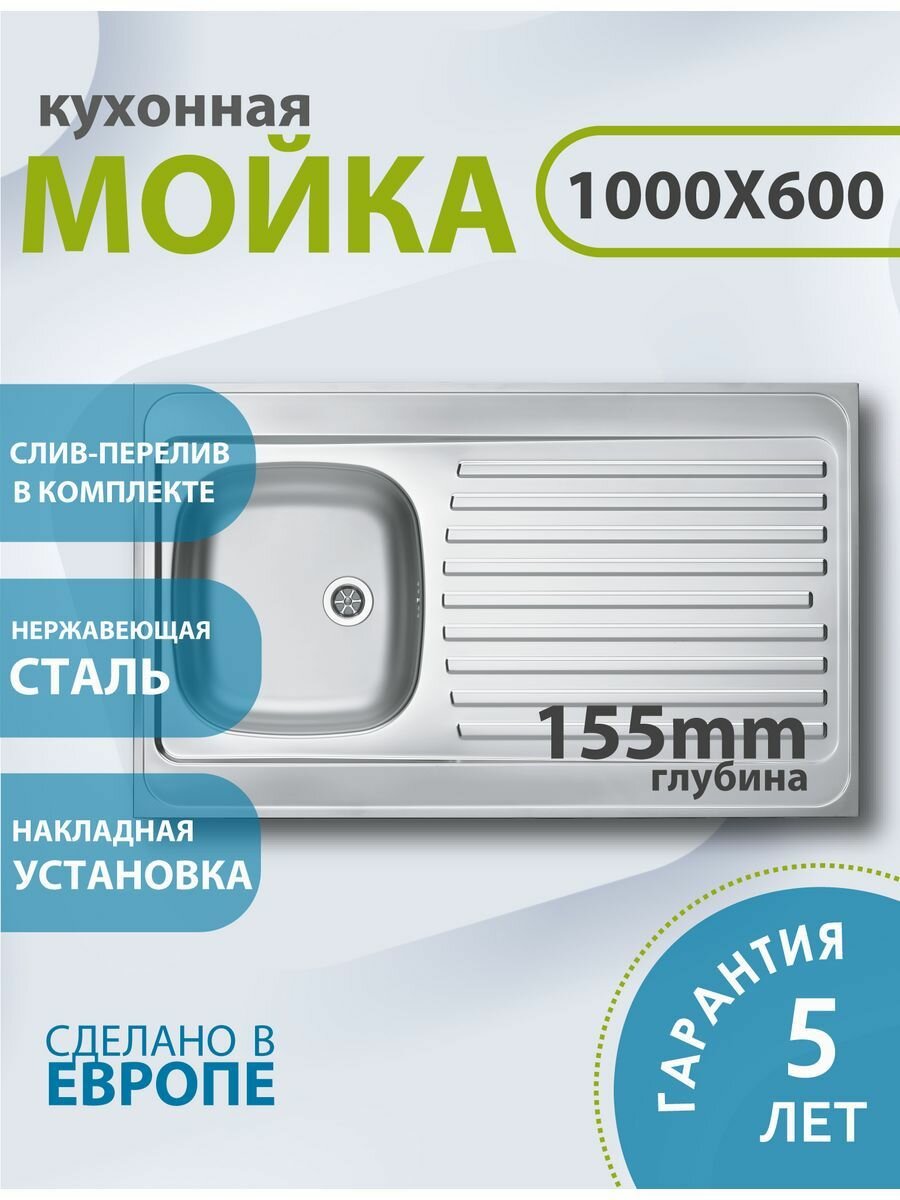 Кухонная мойка Alveus Classic 70 NAT 1000х600х155 нержавеющая сталь, с сифоном (1108745)