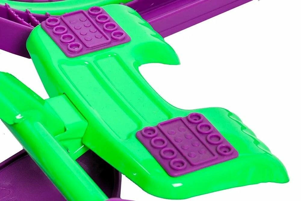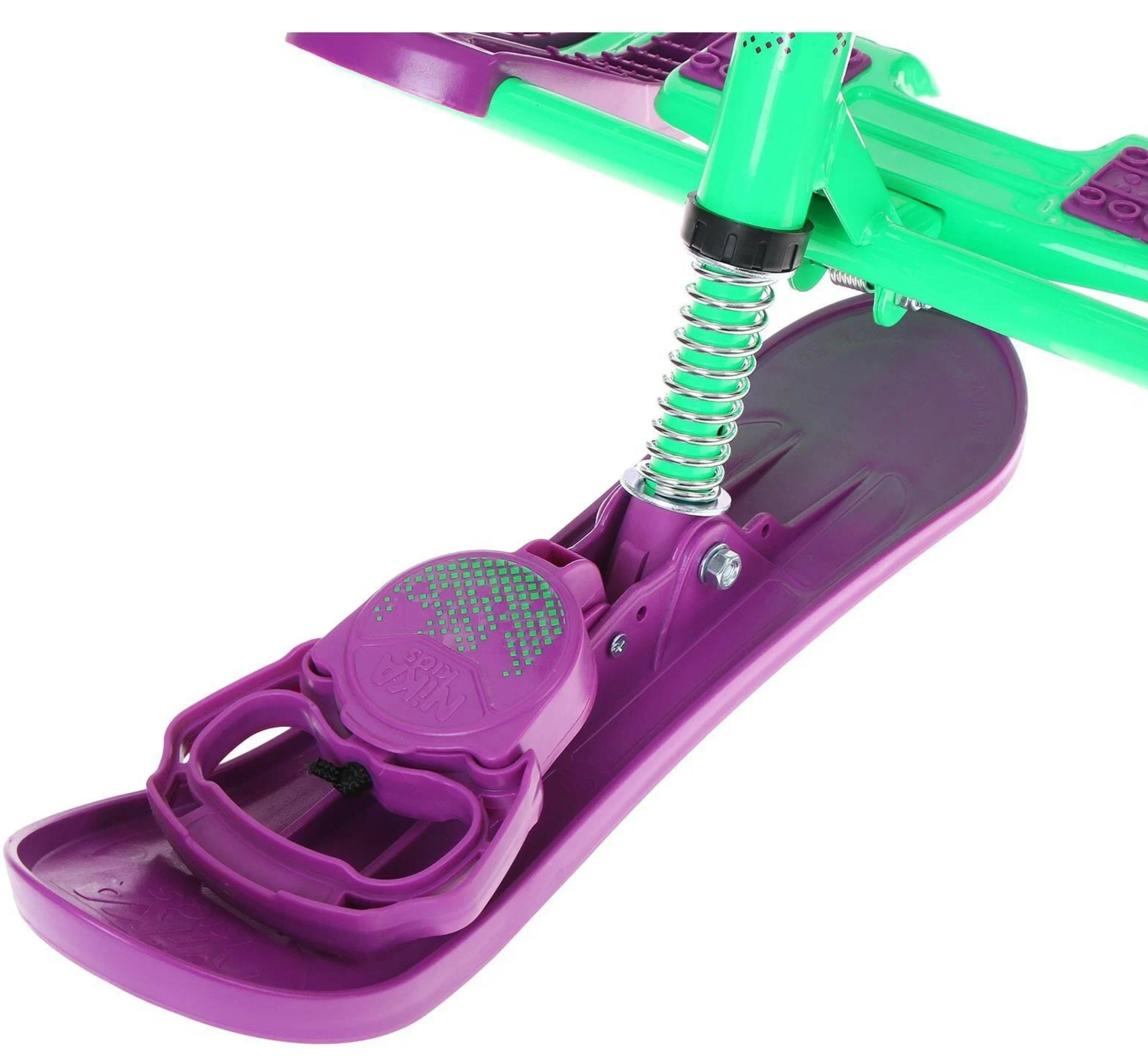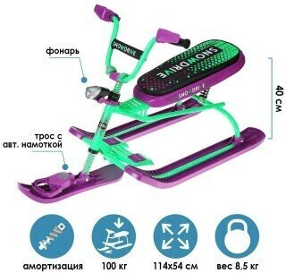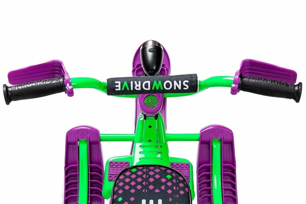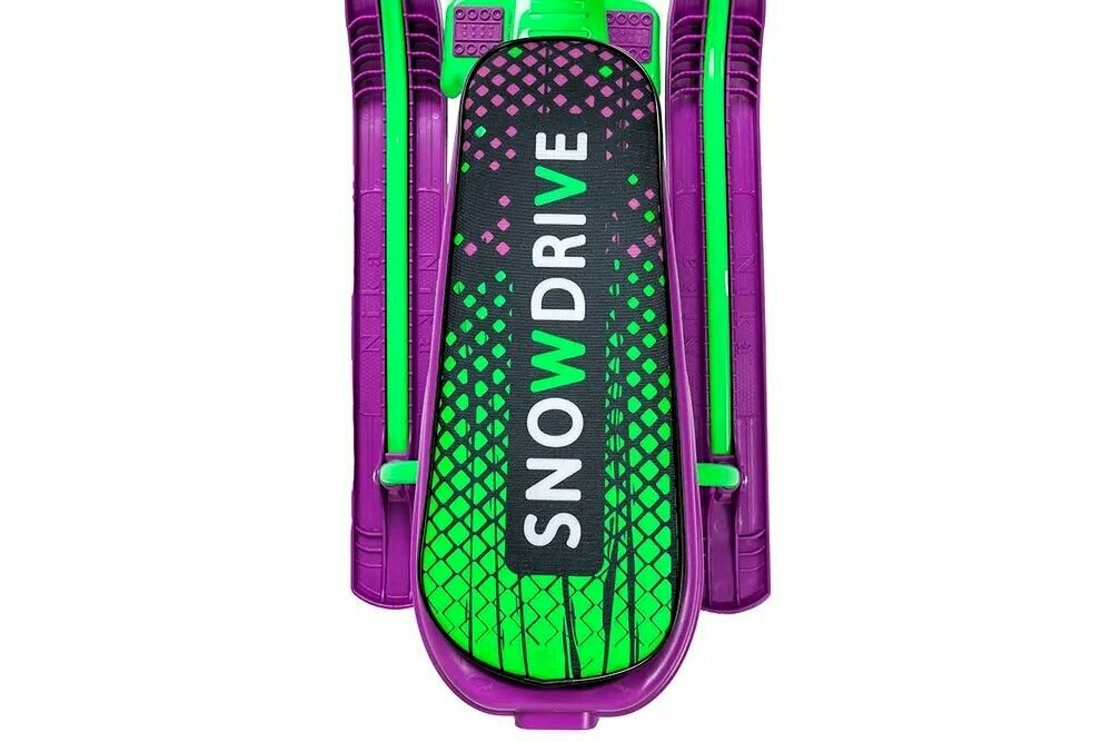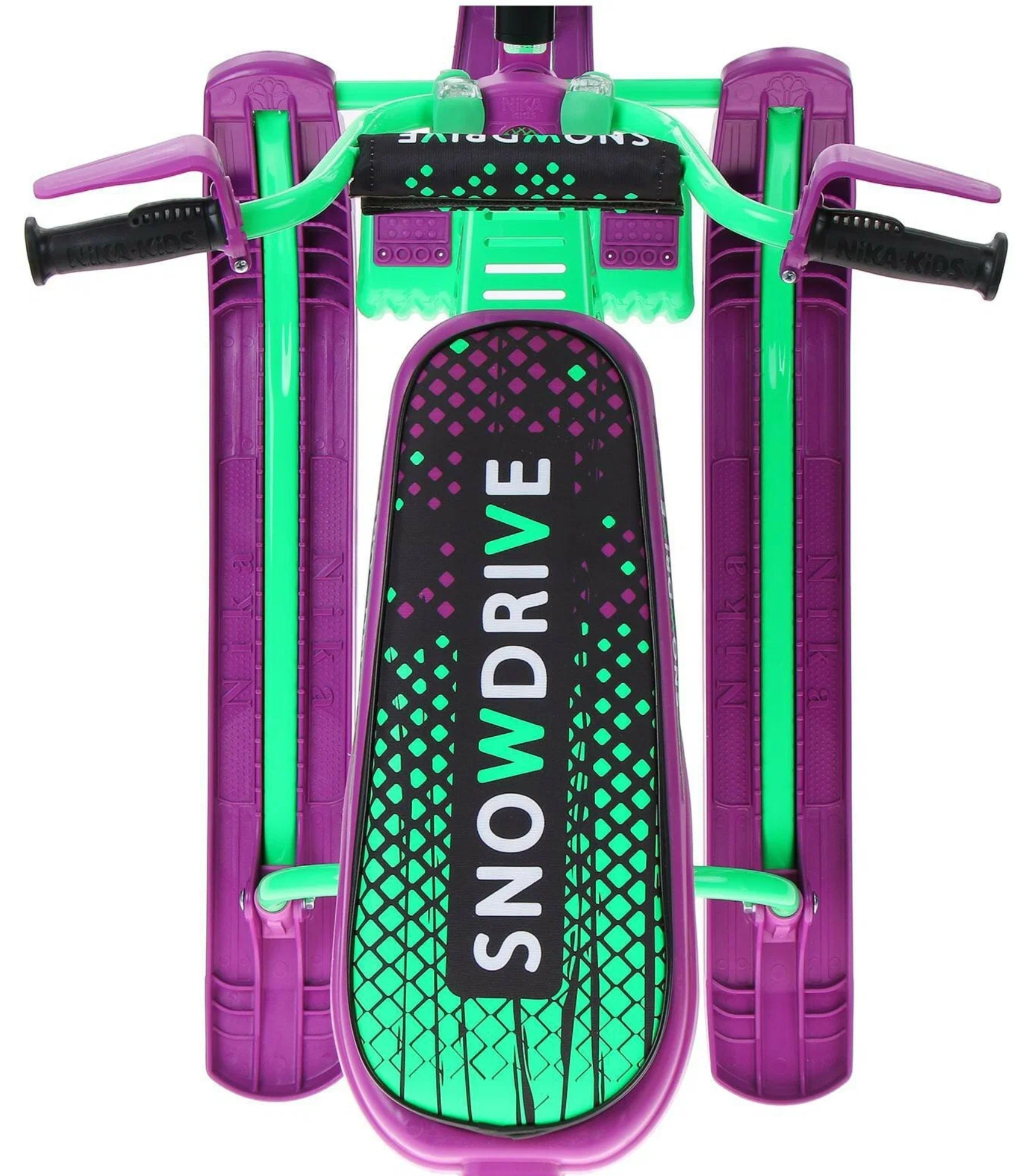 Детский снегокат "Ника-Snowdrive Neon", зимние снежные санки от 3 лет с мягким сиденьем и амортизацией, аргамак, велоруль и буксировочный трос с автоматической намоткой, цвет фиолетово-зеленый