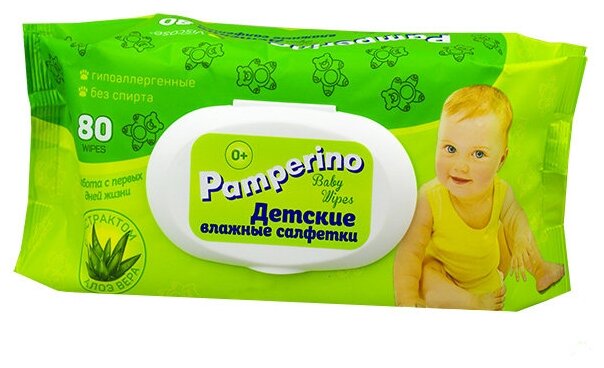 Влажные салфетки Pamperino Детские с экстрактом алоэ вера, пластиковая крышка, 80 шт., 1 уп.