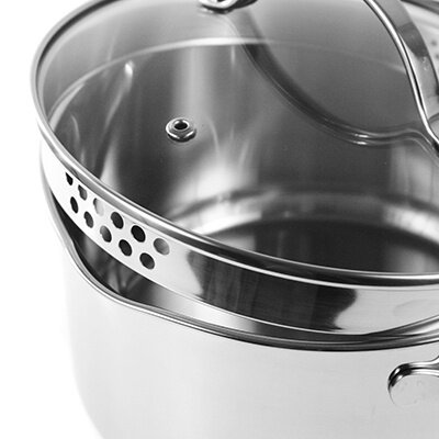 | Плюсы: | Удобно сливать воду с закрытой крышкой через специальный слив (с крупными и мелкими отверстиями в зависимости от готовящихся продуктов) |
