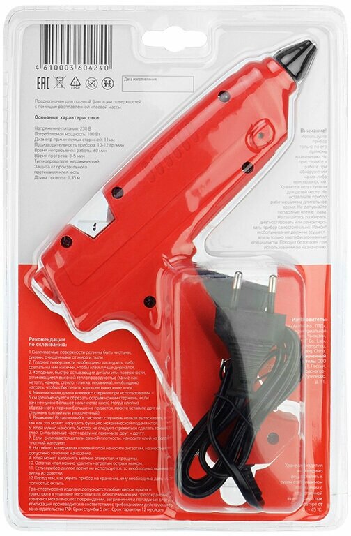 Клеевой пистолет REXANT 12-0105, 220 В, 100 Вт, d 11 мм, 10-12 г/мин, 3-5 мин, 185-200 С