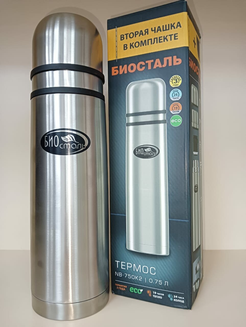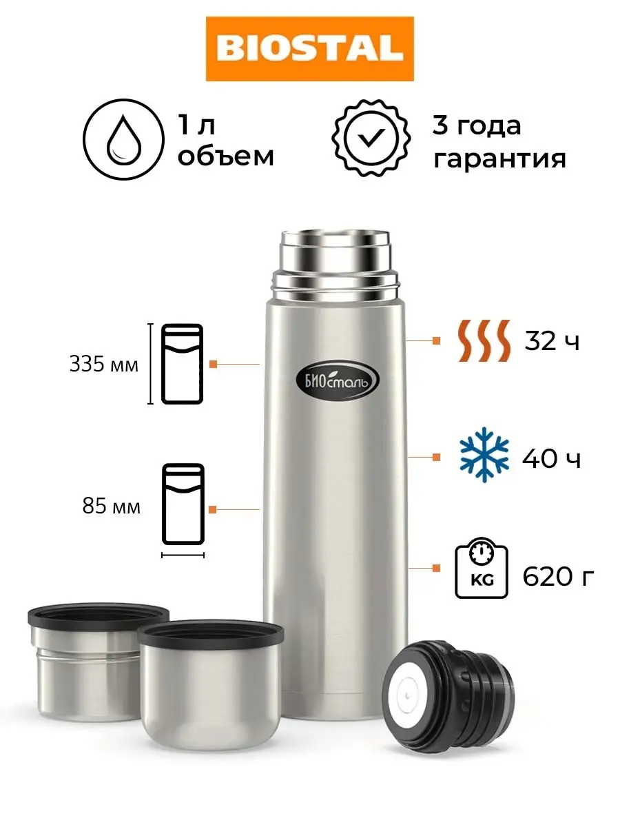 Термос Biostal (0,75 литра) 2 чашки, стальной