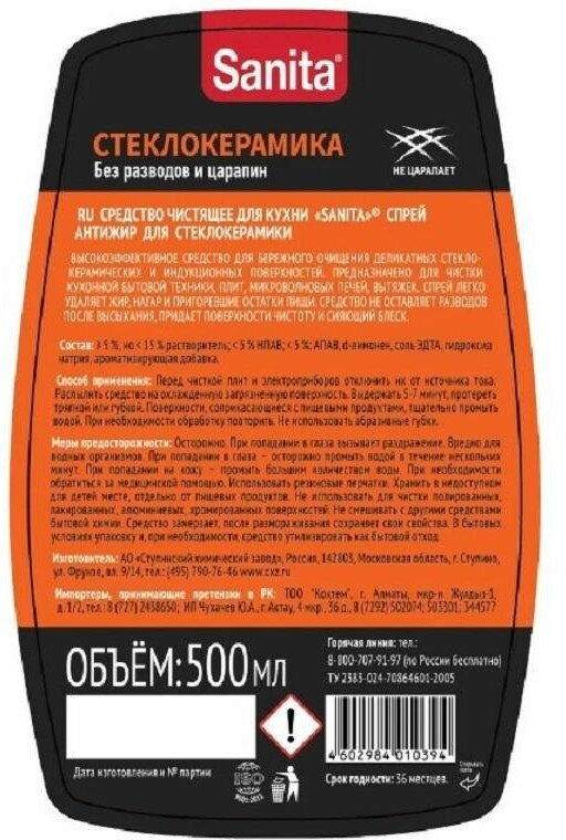 Ступинский химический завод (СХЗ) Спрей Sanita Антижир для стеклокерамики 500 мл