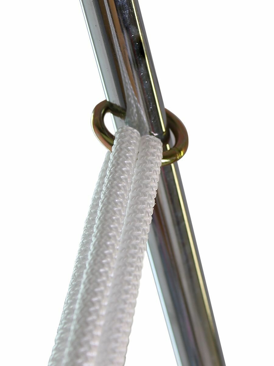 | Минусы: | Ремень хоть и якобы трёх точечный ребенок (9 месяцев) из него элементарного вылезает. Сложновато отрегулировать угол наклона - в итоге просто подвязали узлы на передних верёвках - сделали их короче, тк качели как бы все время "клюют носом". |