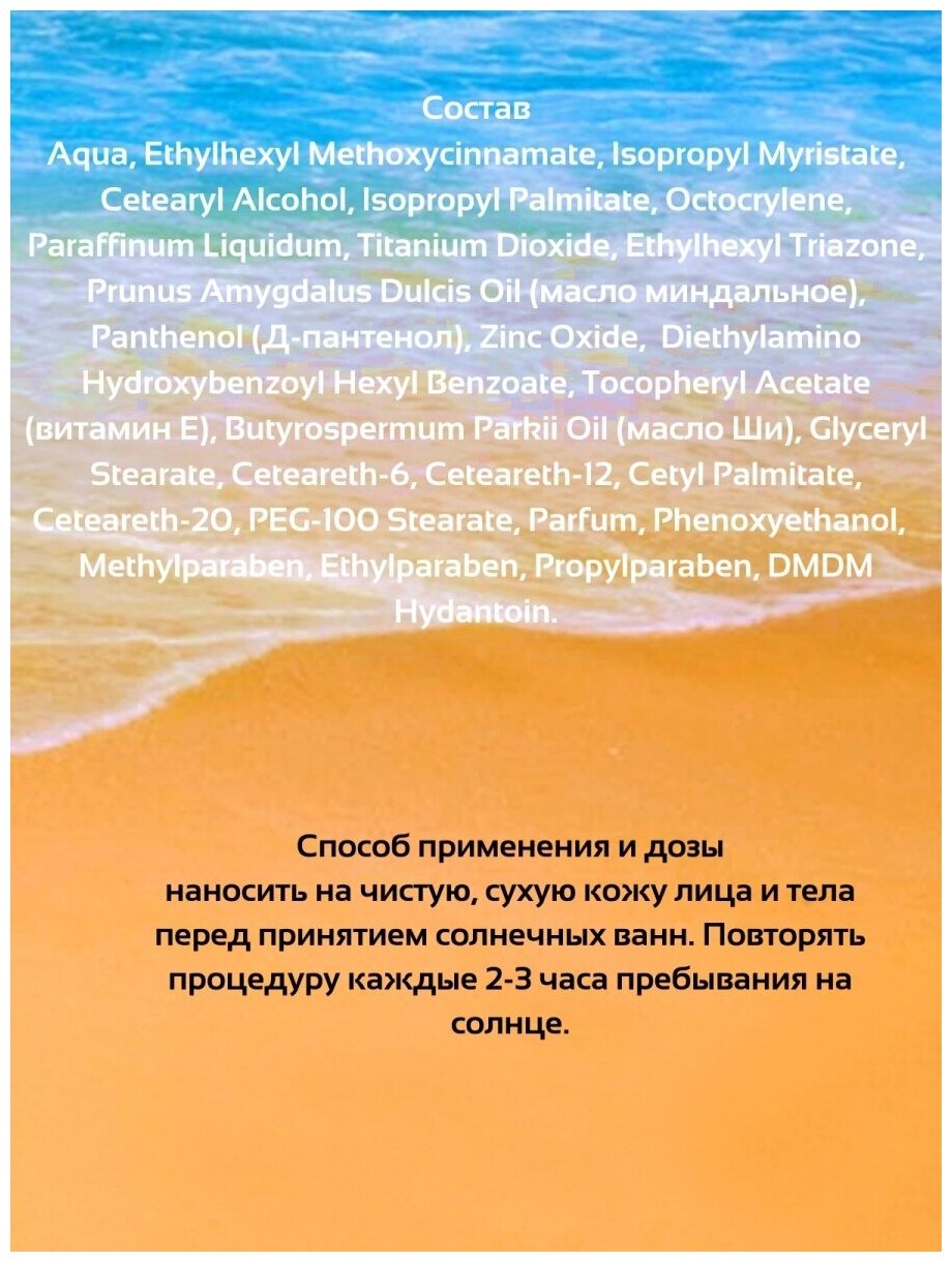 | Отзыв: | Крем очень приятной, тонкой текстуры, с ненавязчивым запахом. Кожу смягчает, не обгорает. |