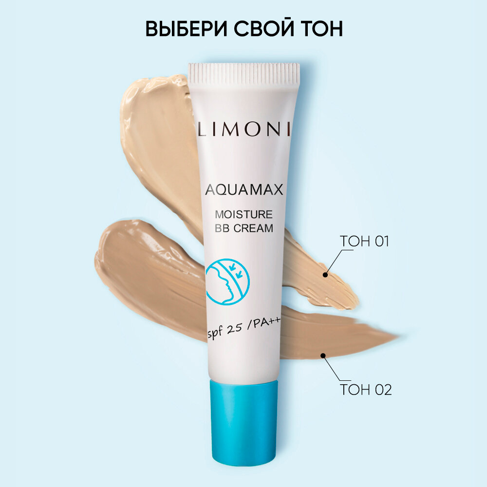 LIMONI Тональный BB крем для лица увлажняющий и выравнивающий тон кожи AQUAMAX SPF 25 PA++ тон №2, 15 мл