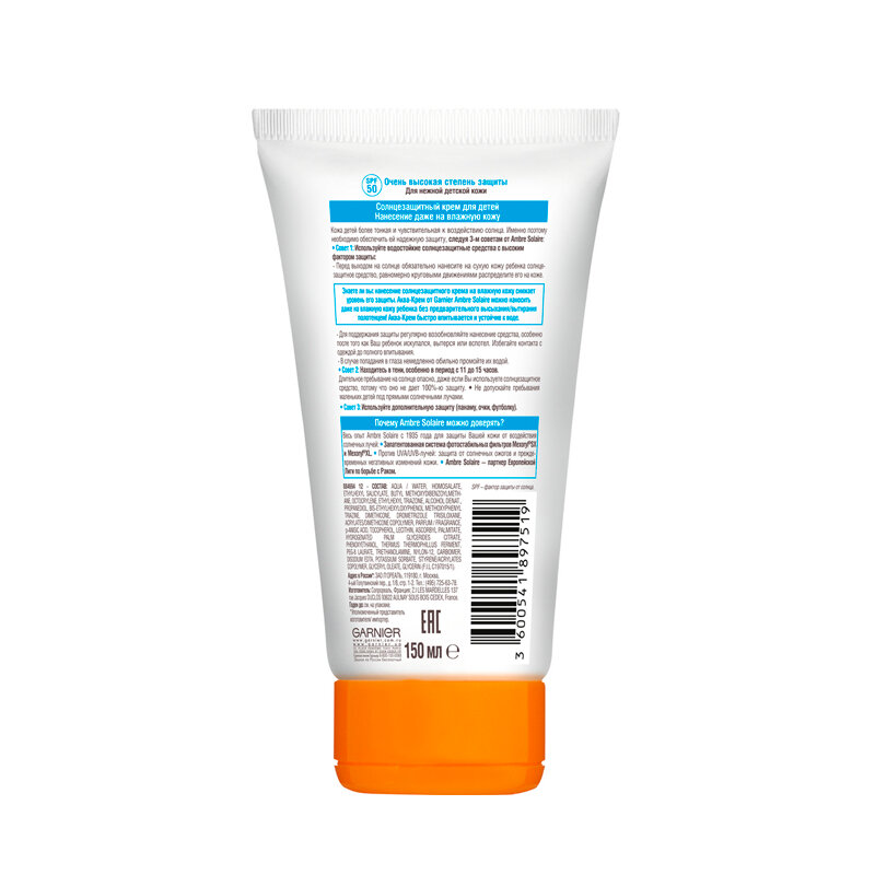 GARNIER Ambre Solaire детский солнцезащитный аква-крем SPF 50, 150 мл