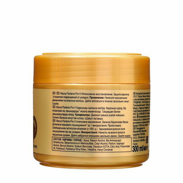 PANTENE PRO-V Маска Интенсивное восcтановление PANTENE 300 мл очень хороший и качественный товар. Маска находится в банке. Удобно наносится на волосы. Экономично расходуется. Не оставляет раздражений на коже головы. Прекрасно восстанавливает структуру волос. Делает их более мягкими и блестящими.