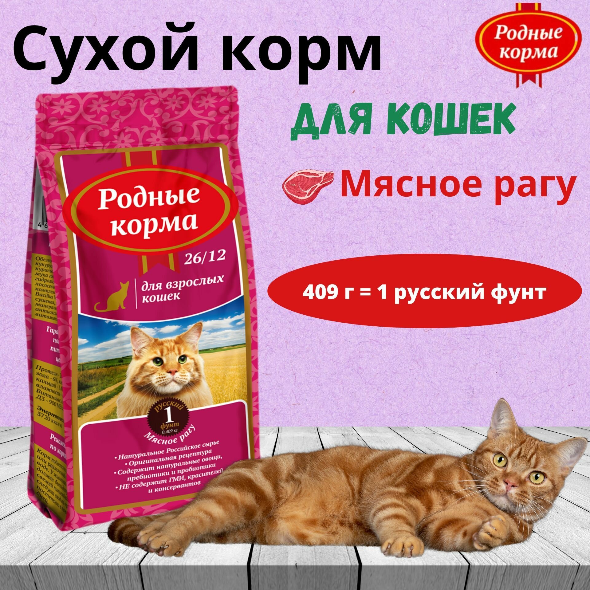 Cухой корм для взрослых кошек мясное рагу, родные корма 26/12, 1 русский фунт, 409 г