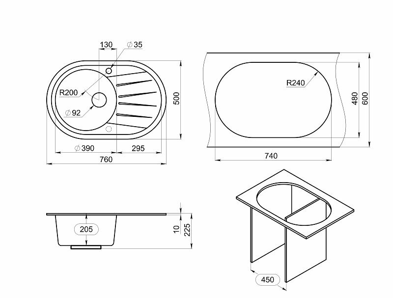 Кухонная мойка кварцевая Granula Standart ST-7601 овальная с крылом, стандарт, чаша D 390, цвет черный (7601bl)