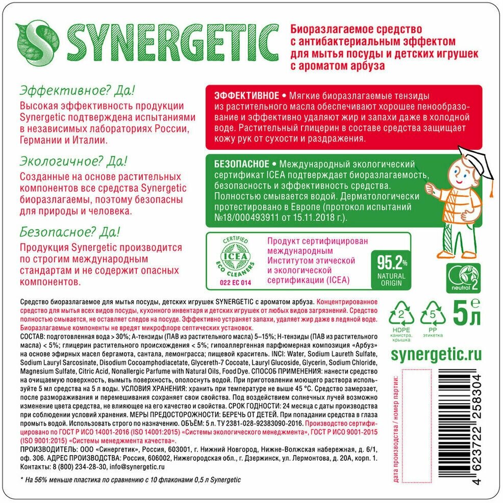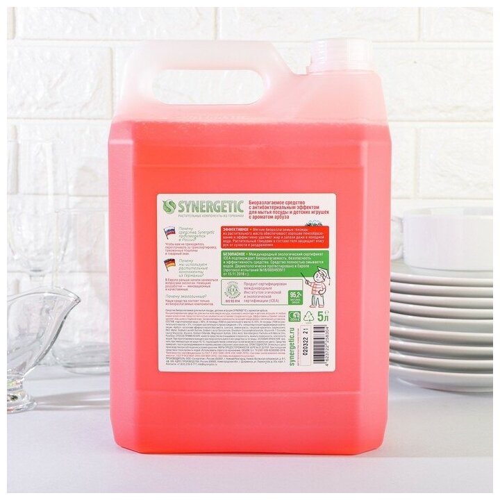 Средство для мытья посуды Synergetic "Арбуз", с антибактериальным эффектом, 5 л