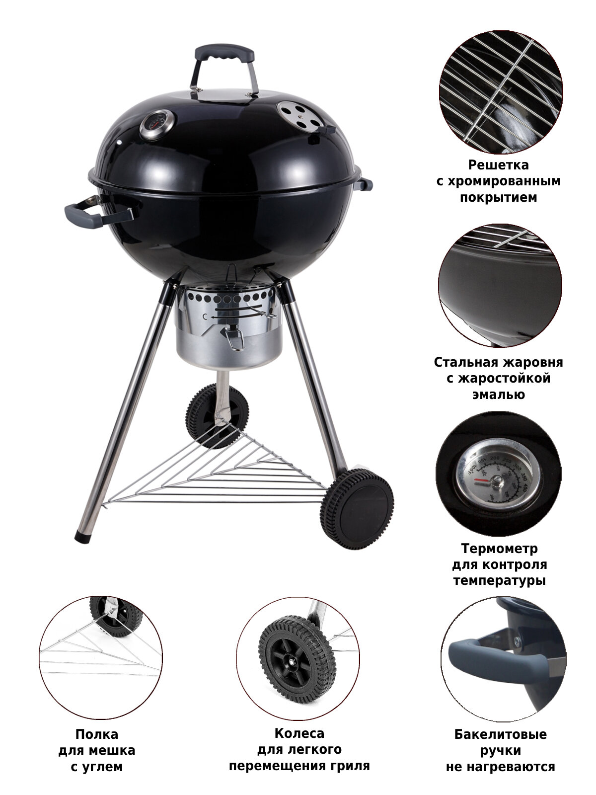 Полностью устраивает. Эмаль на первый взгляд чуть хуже, чем у Weber, но это выражается небольшой шагренью в одном месте и пузырьком диаметром менее 1мм. Все эти дефекты в незаметных местах. Оценю качество эмалировки на 4+ Нет алюминиевых деталей - можно жечь в гриле дрова. В решетке есть люк для удобства подкладывания угольных брикетов. Термометр довольно точный. Наличие зольника огромный плюс. Можно готовить в деревянной беседке или на веранде. Все угольки осыпаются в кастрюльку и не разлетаются по округе даже при сильном ветре. |