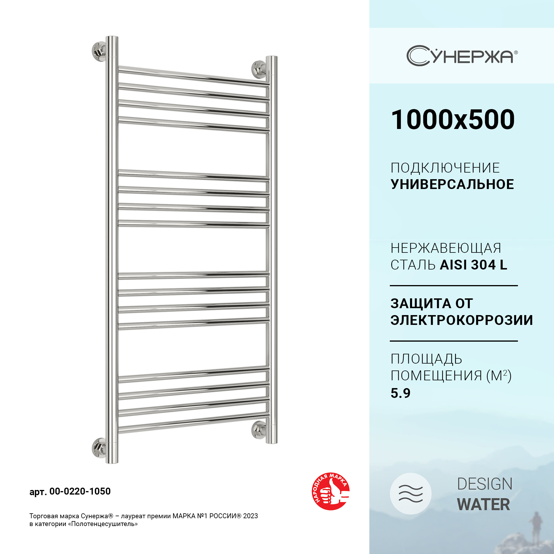 Водяной полотенцесушитель Сунержа Богема+ (прямая) 1000x500 арт. 00-0220-1050