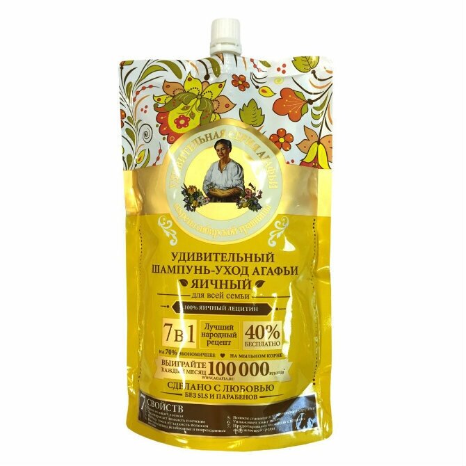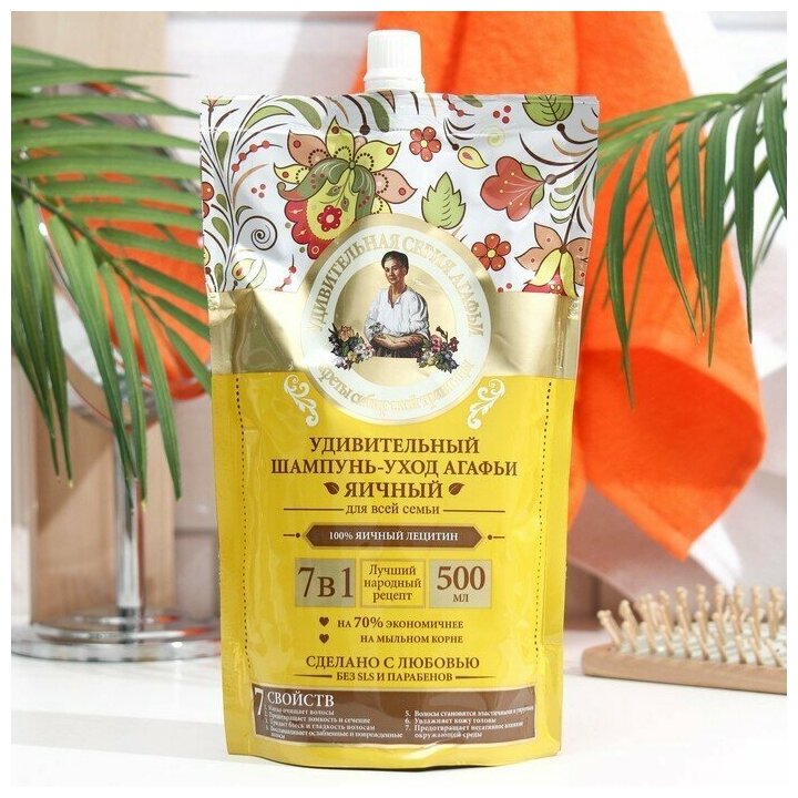 Шампунь для волос Удивительная Серия Агафьи Яичный, 7 свойств, дой пак, 500 мл Рецепты бабушки Ага .