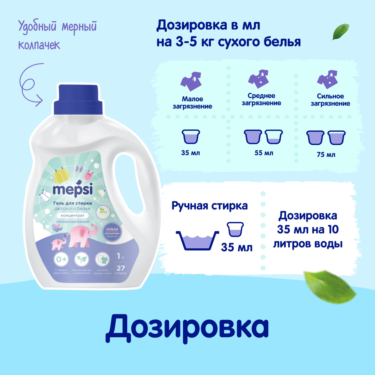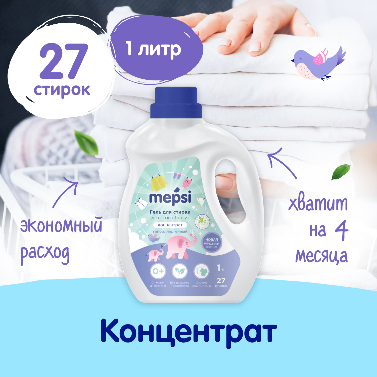 Гель для стирки на 25 стирок MEPSI белья детский 1л. 0+. Жидкий порошок для детского, черного, цветного, белого белья