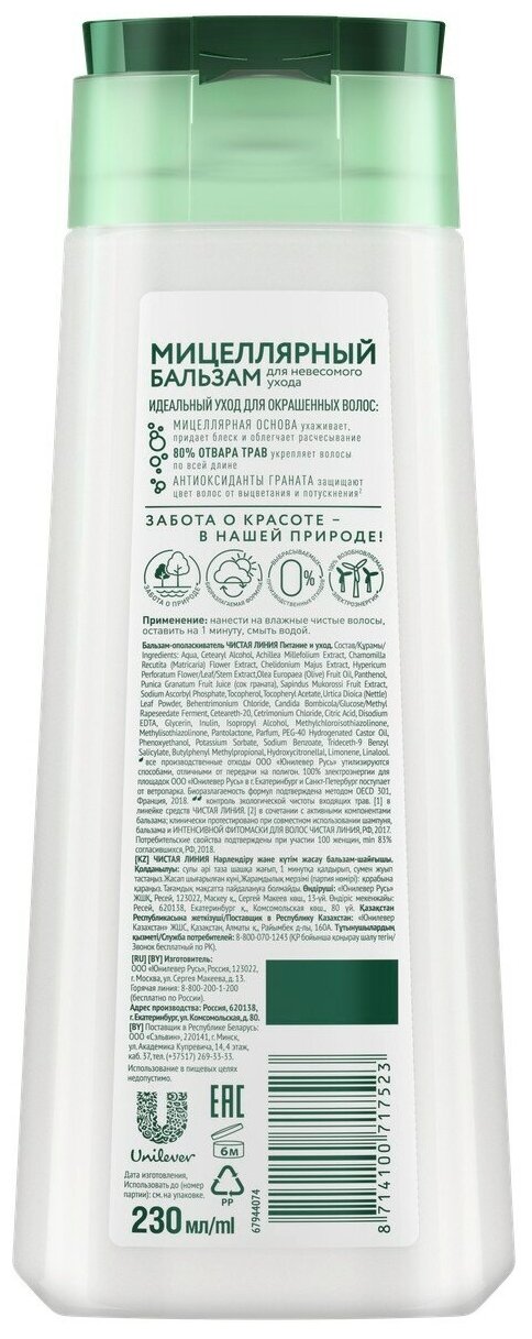 Бальзам-ополаскиватель чистая линия мицеллярный Питание и уход 380 мл.
