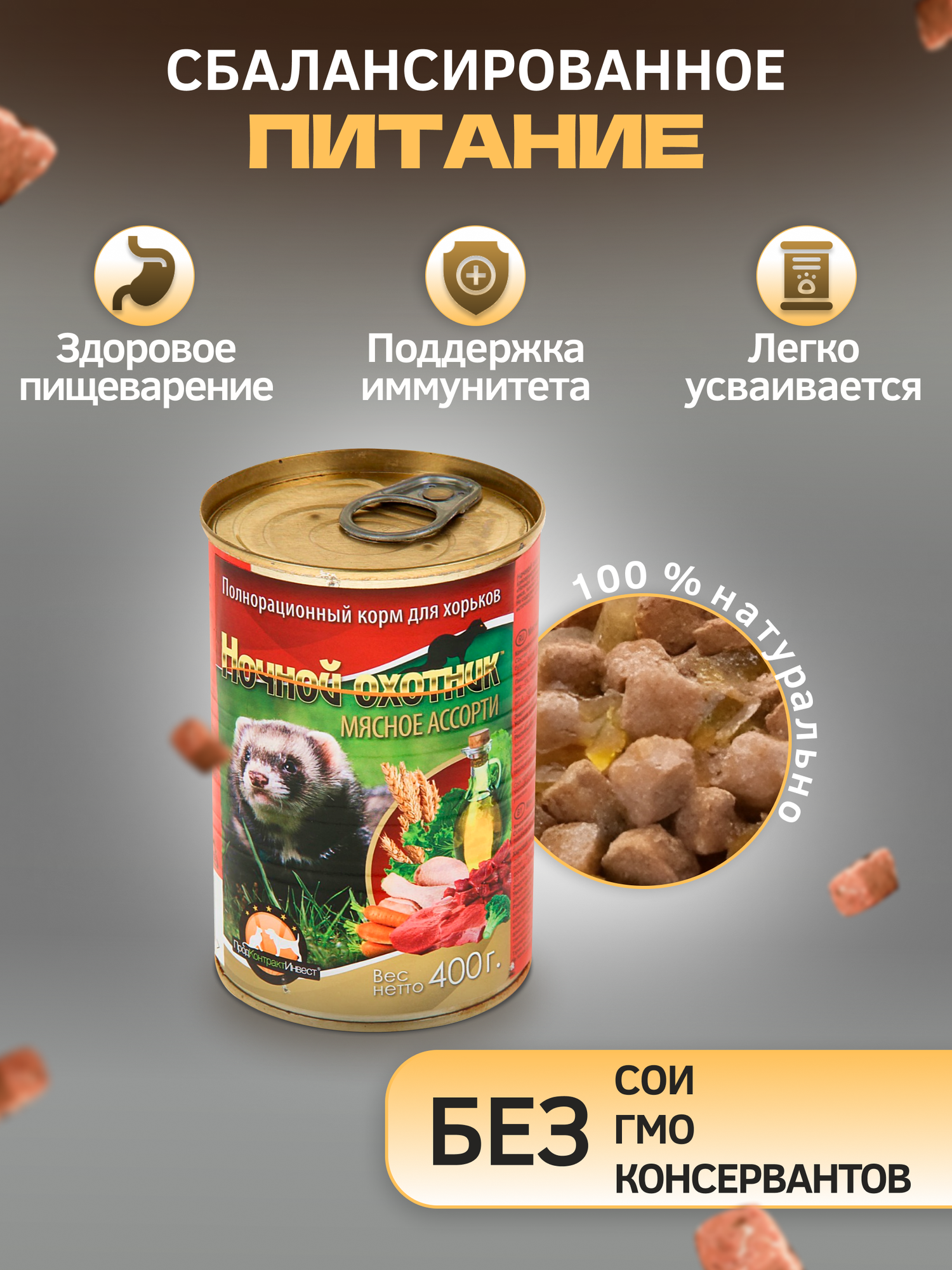 СохранитьКорм для хорьков Ночной охотник мясное ассорти консервированный , 400 г интересное: