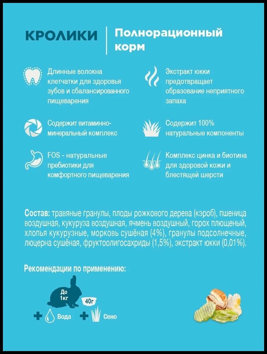 | Плюсы: | Состав, кролик ест с удовольствием |
