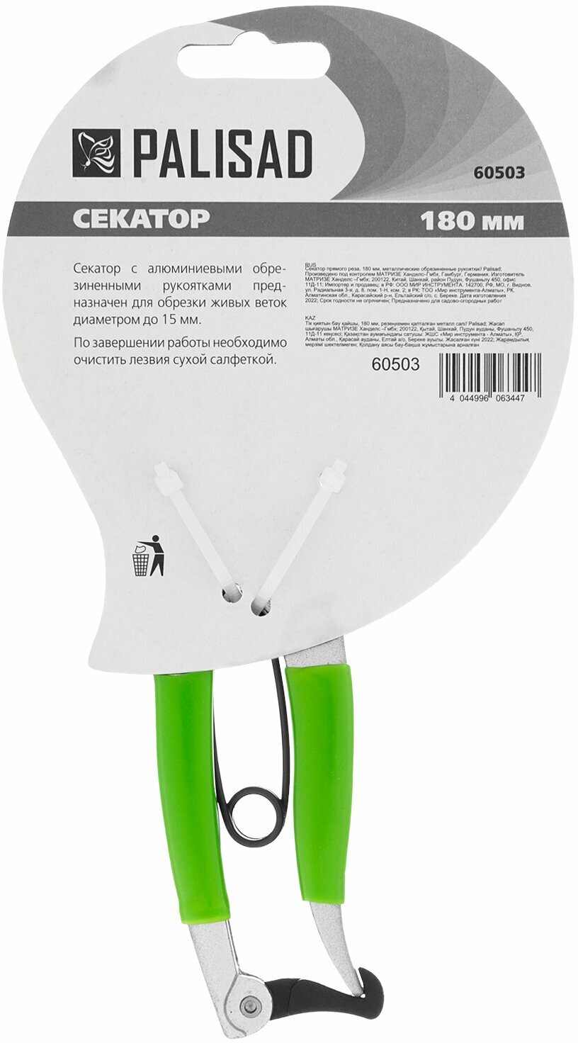 Секатор прямого реза, 180 мм, металлические обрезиненные рукоятки, Palisad (60503)