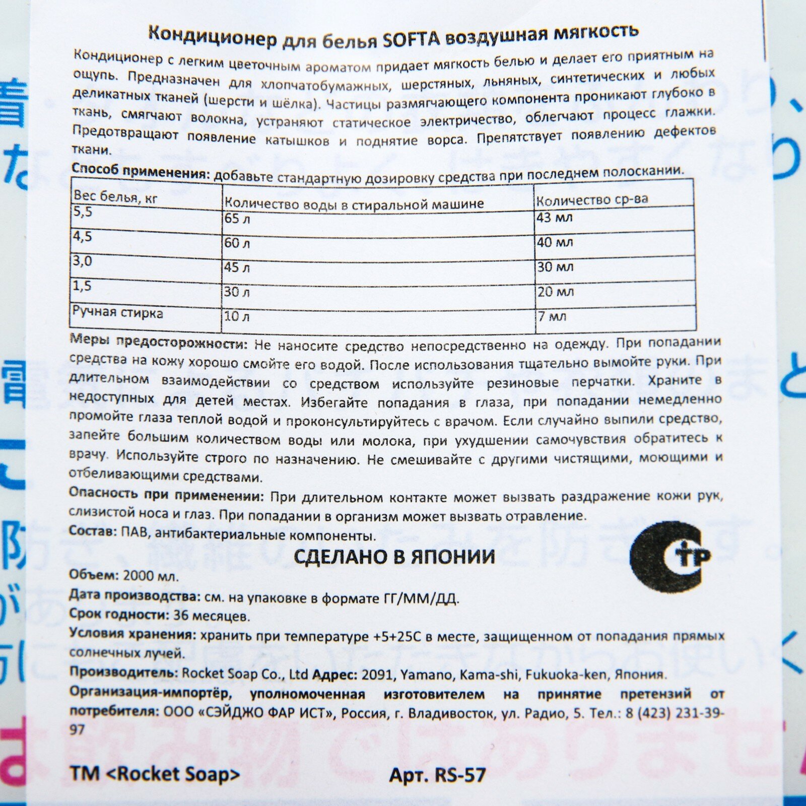 Rocket soap fuwafuwa кондиционер для белья, воздушная мягкость, 2000 мл