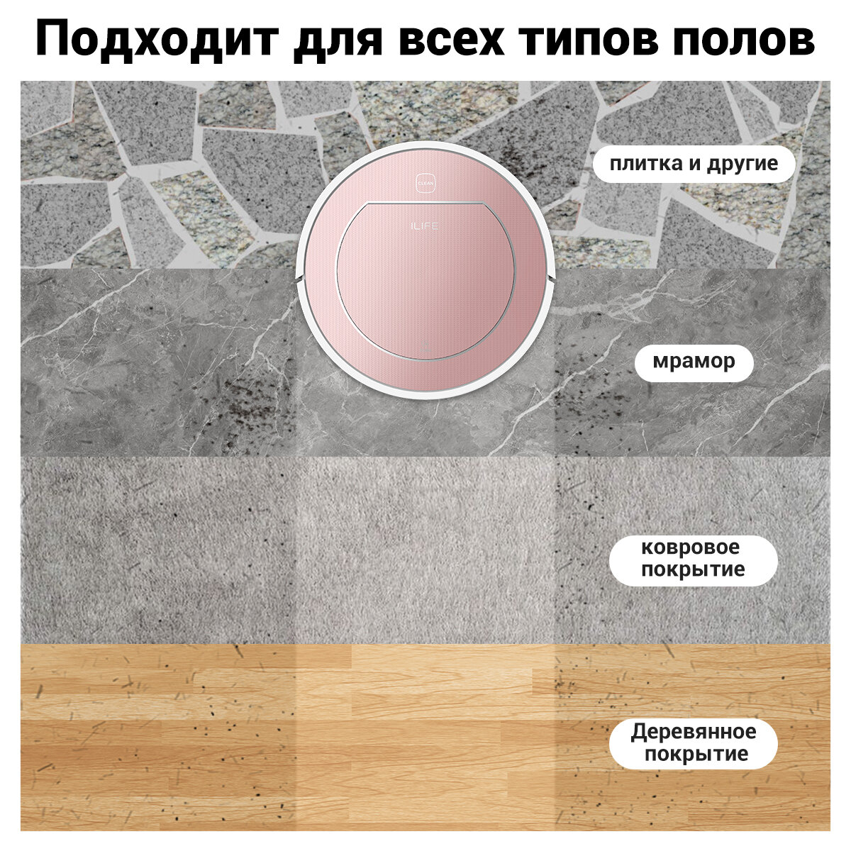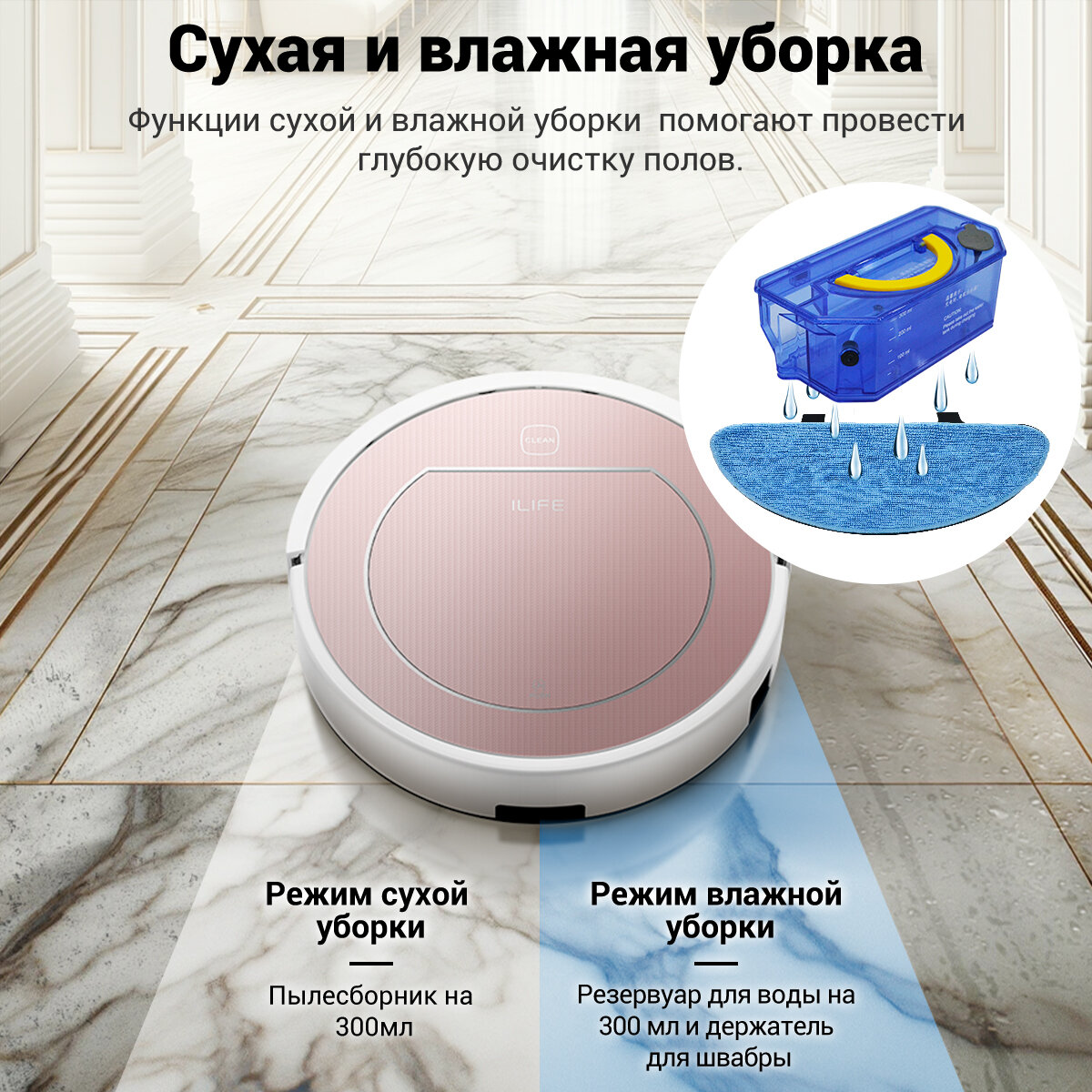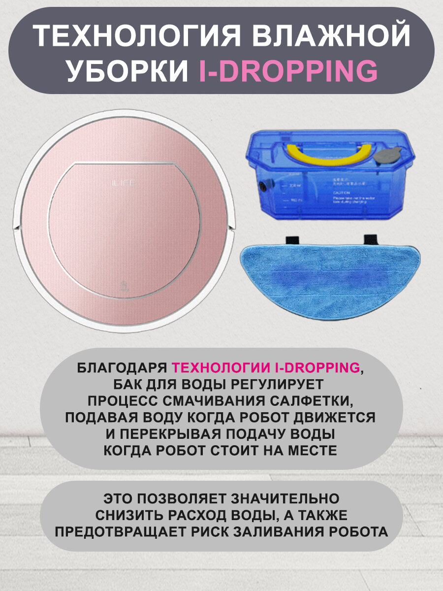 Робот-пылесос для дома для влажной и сухой уборки ILIFE V7s Plus, 2600 мАч, время работы 120мин, высота 84мм, розово-белый интересное:
