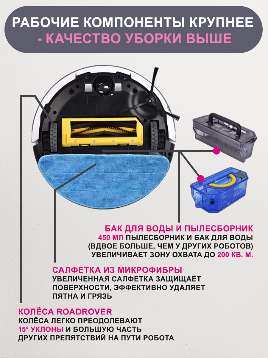 | Плюсы: | Большой, даже не ожидала, но не расстроилась, хорошо убирает пыль, грязь, одновременно может мыть пол и собирать пыль, не знаю кто пишет, что у него плохо это получается, но я довольна! Да, конечно есть доп контейнер для воды, чтобы протирал пол, и тряпочка 2 шт, щетка боковая запасная тоже есть, в общем , в комплекте все есть с запасом! Я рада была! Хватает нам на всю квартиру в 33 метра, за 2 часа все успевает одновременно и пыль собрать и протереть полы! Пока с ребёнком гуляю, он отлично справляется, главное все с пола поднять! Доп станцию сам находит, если села зарядка. |