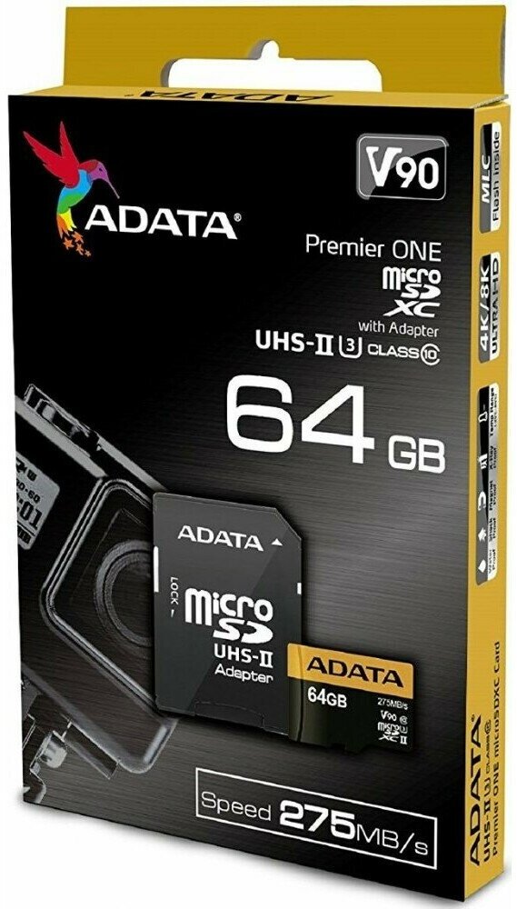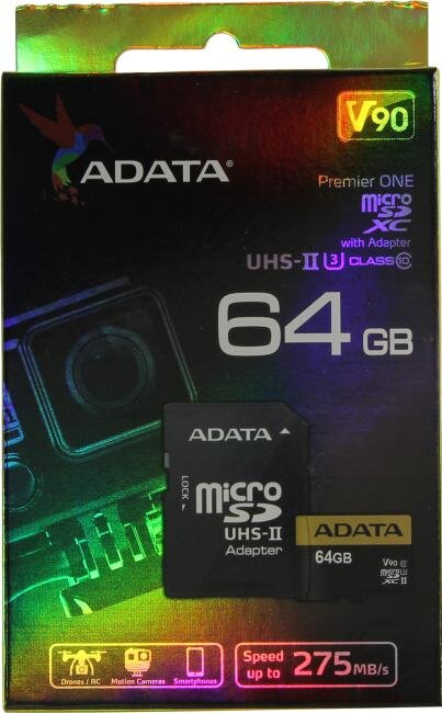 Карта памяти ADATA microSDXC 64 ГБ Class 10, V90, UHS-II U3, R/W 275/155 МБ/с, адаптер на SD (AUSDX64GUII3CL10-CA1)