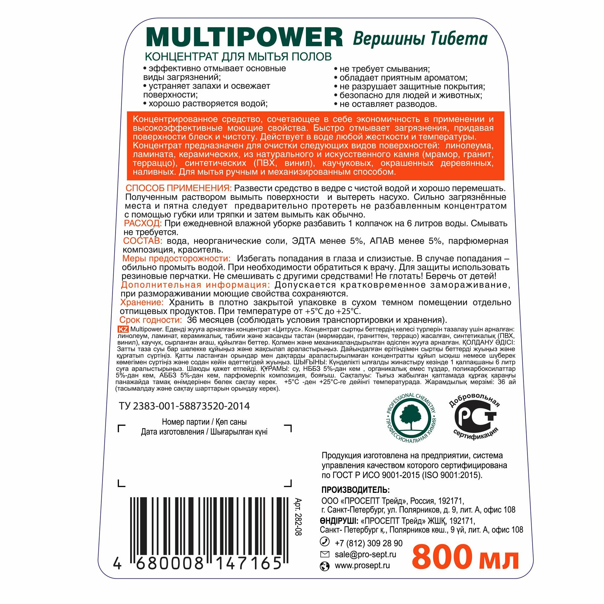 Средство для мытья полов "MULTIPOWER" (вершины тибета) концентрат 800 МЛ (1/12) "PROSEPT"