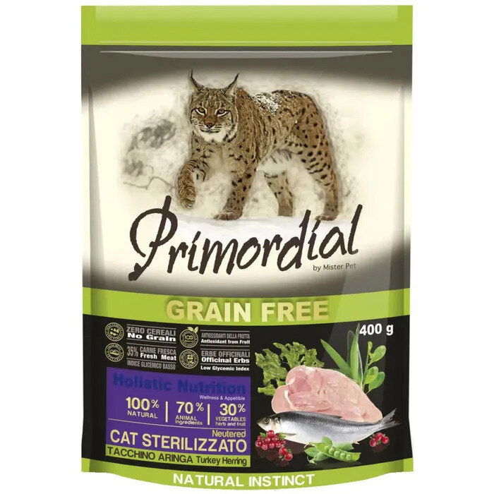 PRIMORDIAL Беззерновой корм для стерилизованных кошек с индейкой и сельдью 64781 0,4 кг 34332