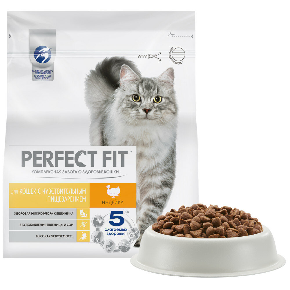 Корм сухой для взрослых кошек PERFECT FIT с индейкой, с чувствительным пищеварением, полнорационный, 2,5кг