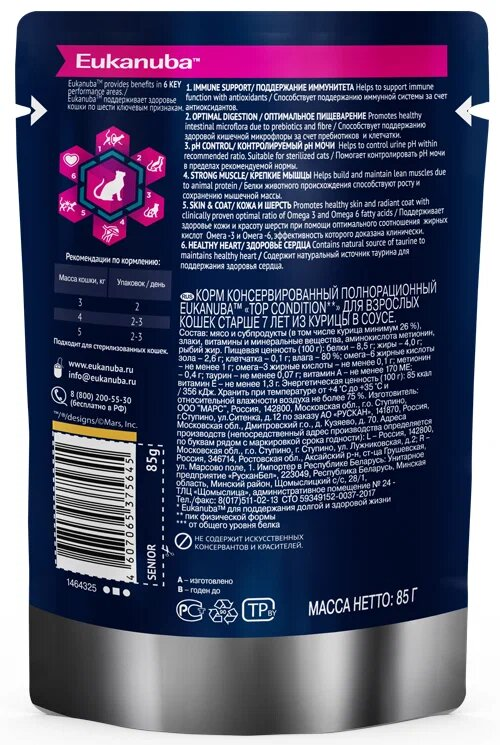 Eukanuba SENIOR TOP CONDITION CHICKEN пауч влажный корм для кошек старше 7 лет, курица в соусе, 85 гр
