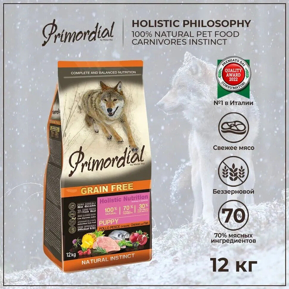 PRIMORDIAL Корм беззерновой для щенков всех пород курица рыба, 12кг