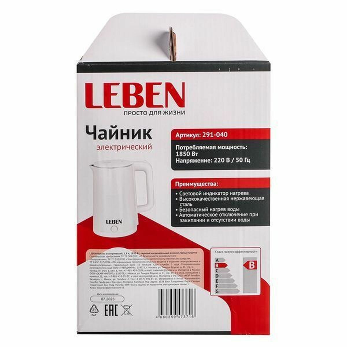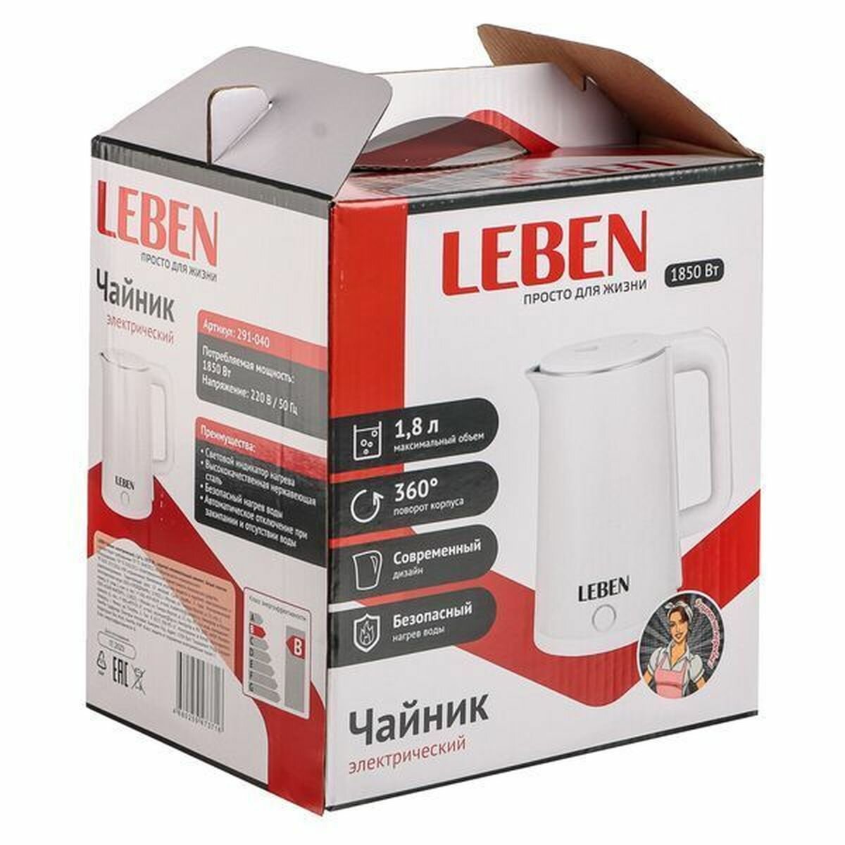LEBEN Чайник электрический 1,8л, 1850Вт, скрытый нагревательный элемент, белый пластик 291-040