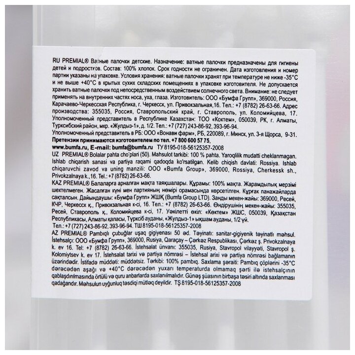 Ватные палочки для детской гигиены PREMIAL с ограничителем, 100% хлопок, 50 шт