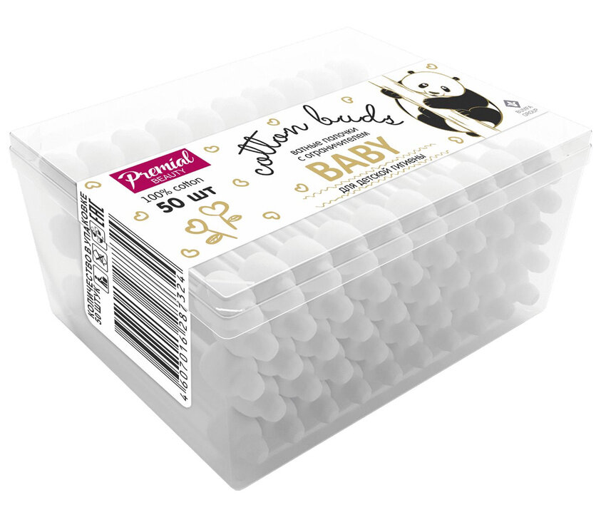 Ватные палочки Premial для детской гигиены с ограничителем, белый, 50 шт., контейнер