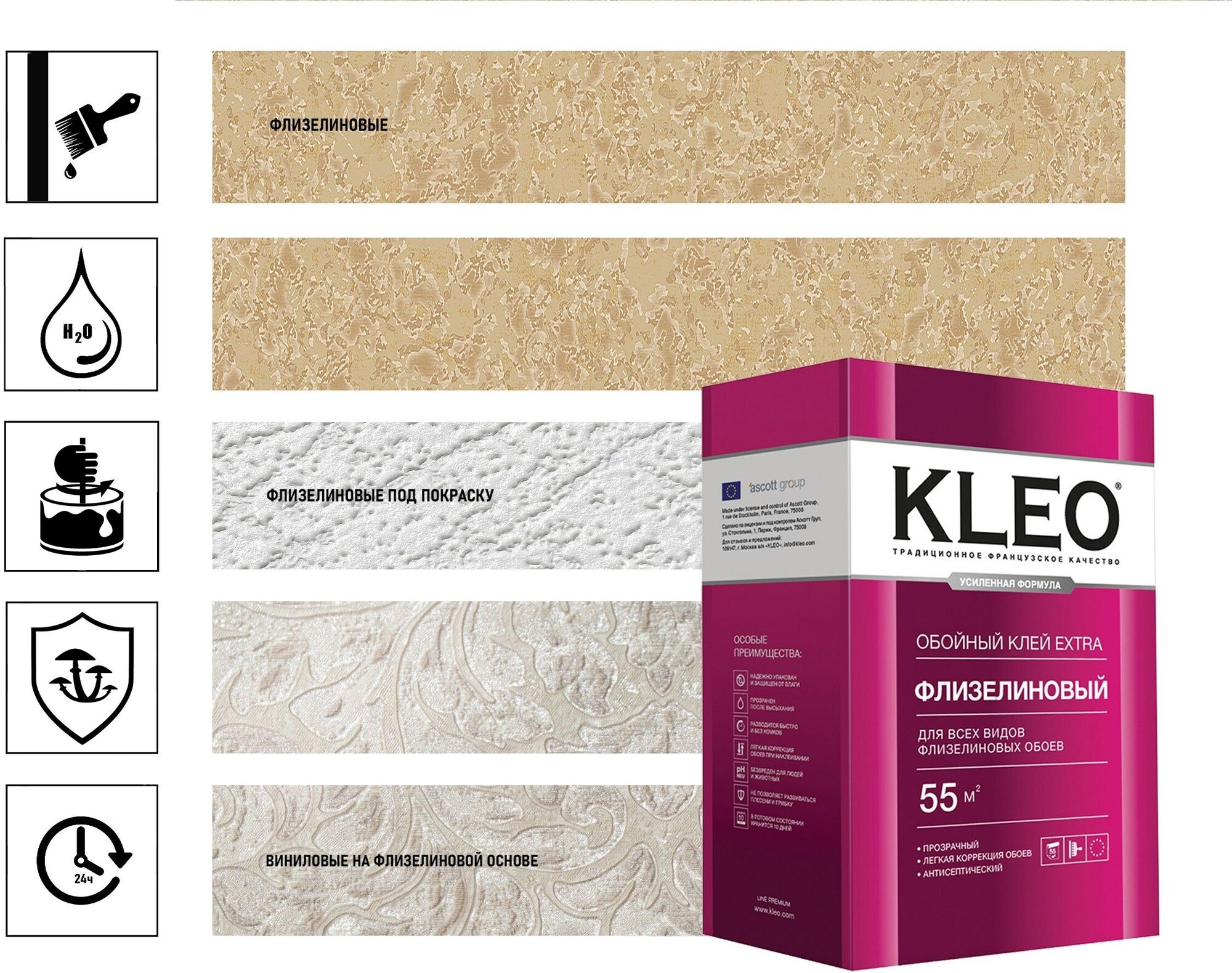 Клей готовый для флизелиновых обоев KLEO EXTRA на 25 кв.м для приклеивания всех видов флизелиновых обоев, виниловых обоев и фресок на флизелиновой основе, малярного (ремонтного) флизелина.