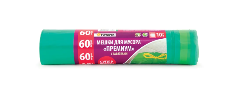 Мешки для мусора Paterra "Premium", ПВД, с завязками, 60 л, 10 шт