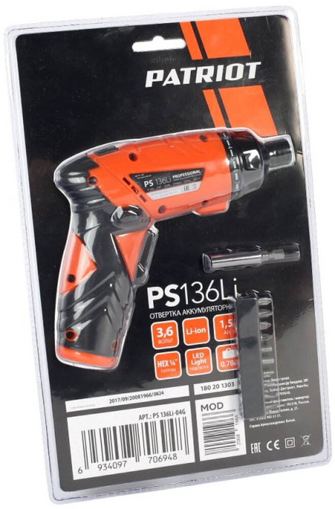 Отвертка аккумуляторная PATRIOT PS 136; напряжение: 3,6V; блистер; комплект бит, шт PATRIOT