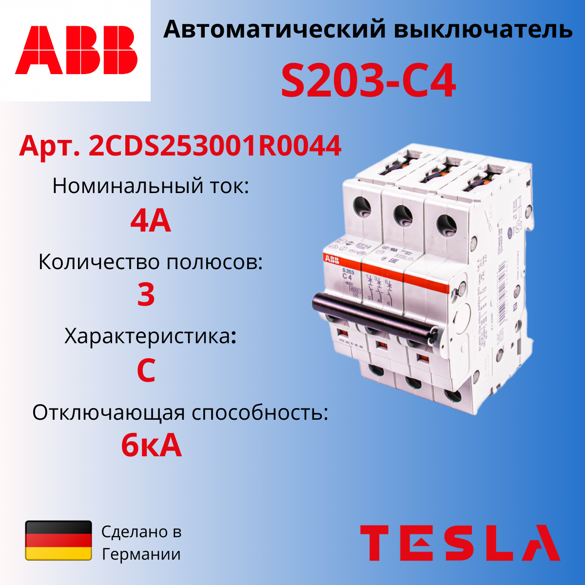 Автоматический выключатель на Din-рейку 2CDS253001R0044 C4 АВВ S203 C4А/3п/ 6,0кА
