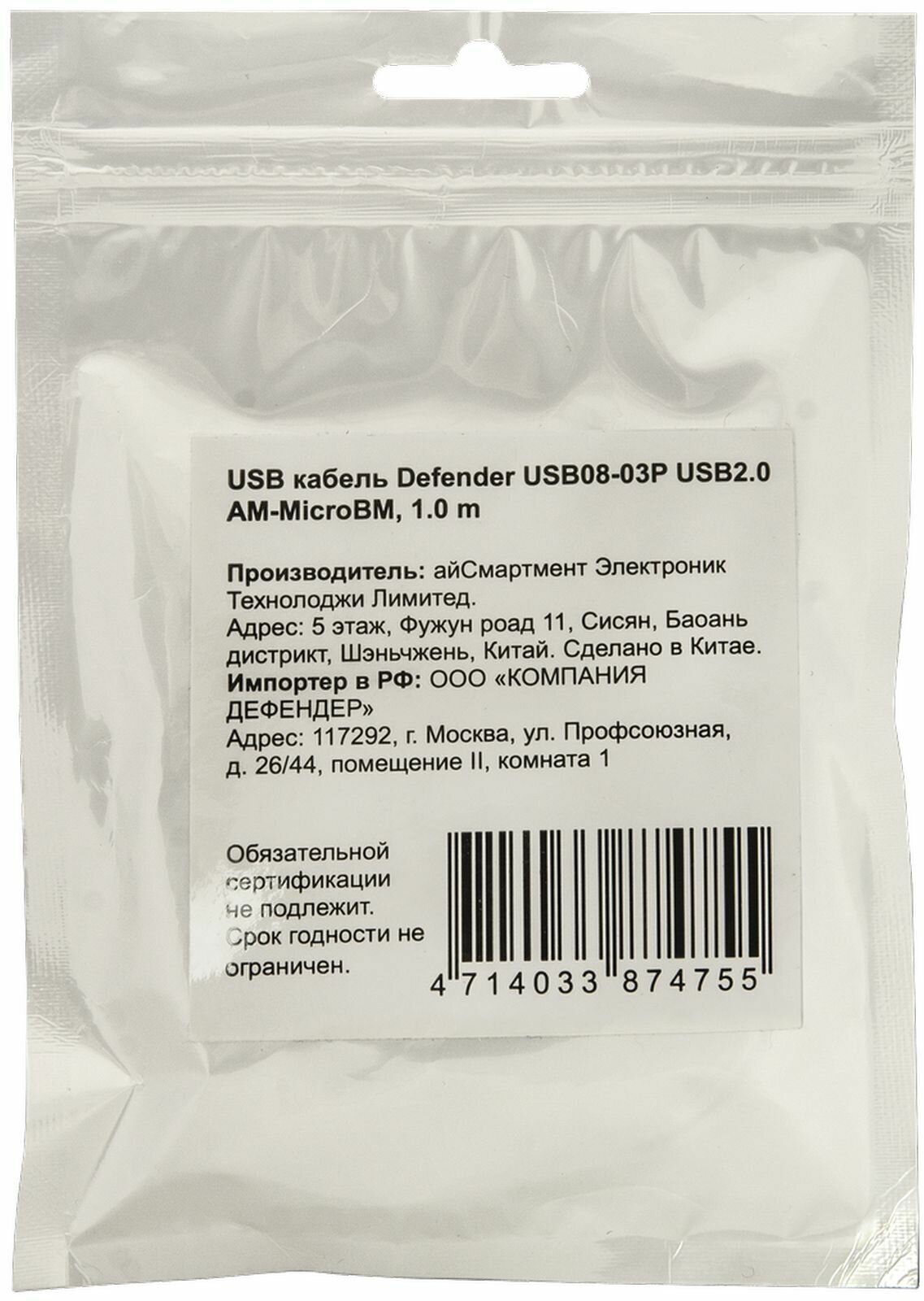 USB кабель Defender USB08-03P USB2.0 AM-MicroBM, 1.0м пакет