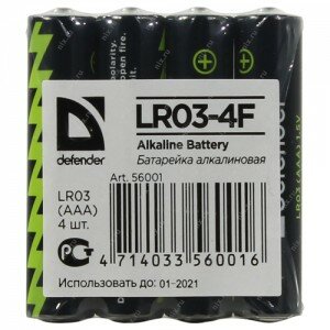 Батарейка AAA щелочная Defender LR03-4F, alkaline, в термоплёнке 4шт.