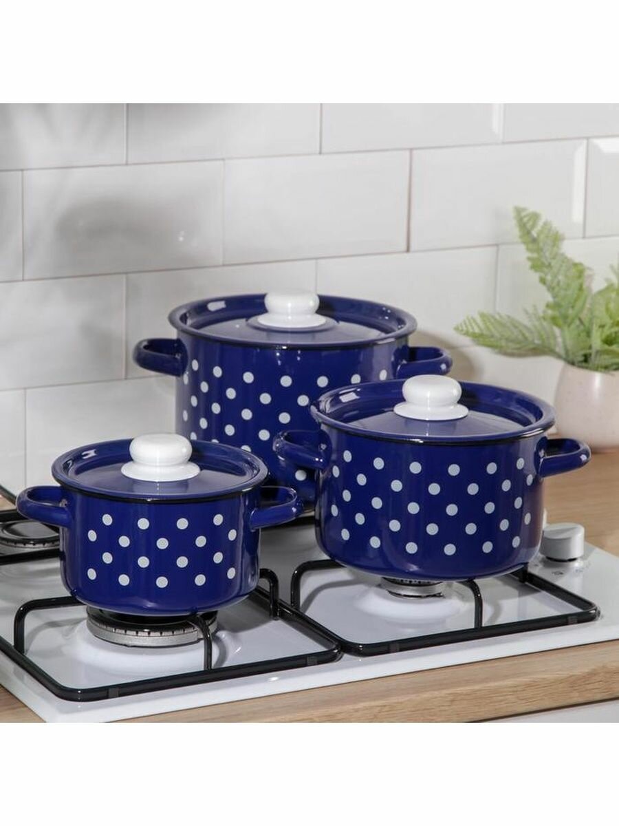 Стальэмаль Набор кастрюль «Белый горох», 3 предмета: 1,5 л, 2,9 л, 4,5 л, индукция, цвет синий