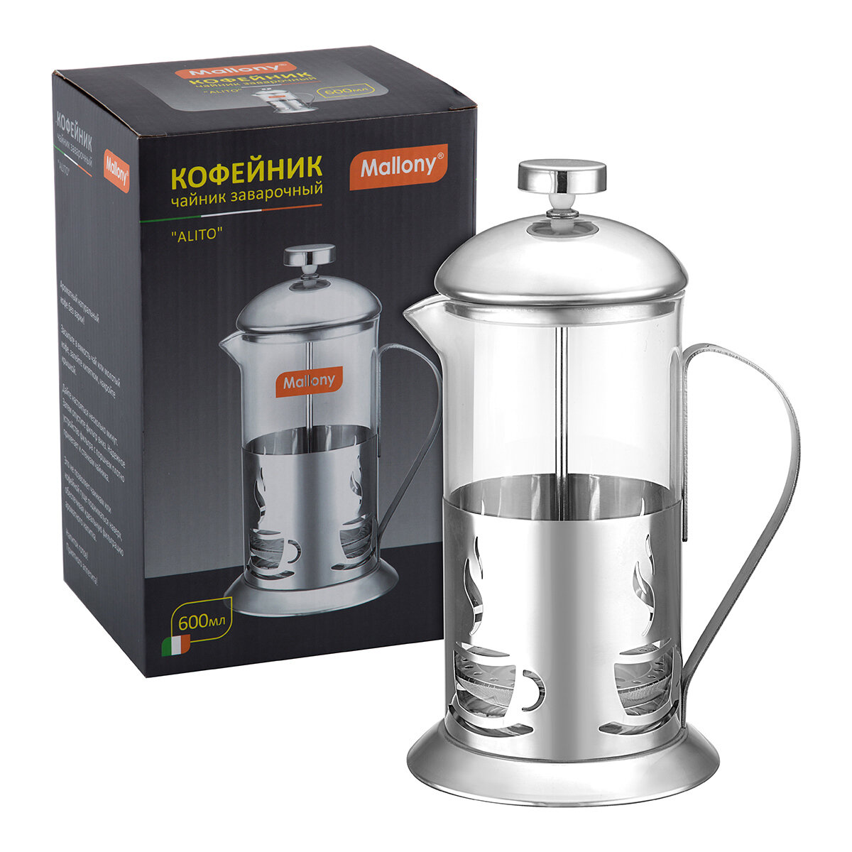 Чайник/кофейник (кофе-пресс) стеклянный, 600 мл, в корп из нерж ст, ALITO, тм Mallony